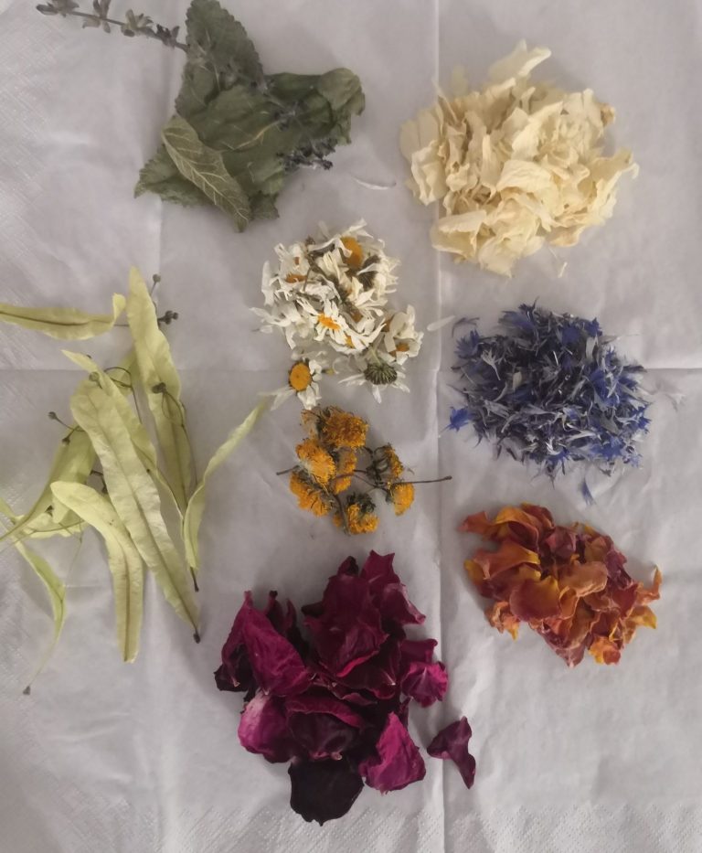 Lindenblüten (links), wilder Salbei (oben links), Jasminblüten (oben rechts), Kornblumen (Mitte rechts), Rosenblüten hell (unten rechts), Rosenblüten dunkel (unten Mitte), Margeriten-blüten (Mitte oben) und Löwenzahnblüten (Mitte unten)